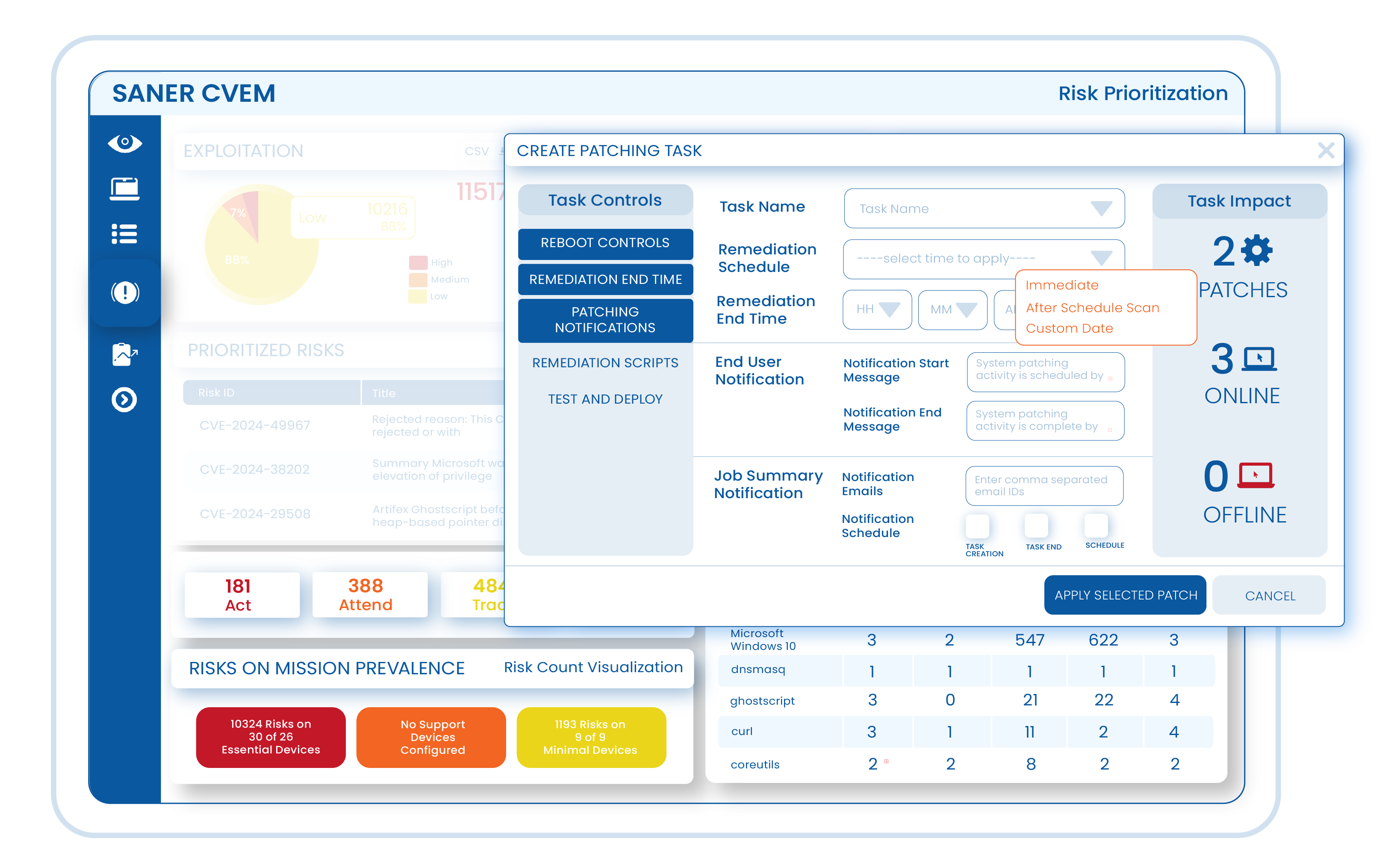 Saner CVEM’s integrated remediation engine, powered by SecPod, consolidates detection, prioritization, and remediation into a single platform. This continuous and automated process accelerates risk mitigation, reduces reliance on multiple tools, and ensures that critical vulnerabilities are promptly addressed.